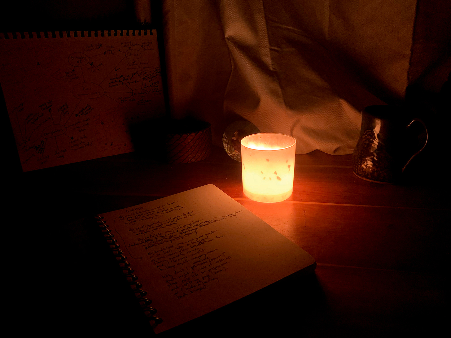 Bedtime Under the noise— of airline jets, interstate traffic, and my buzzing brain are the slow sounds of life being alive— the evening rain filtering softly through trees, my breath finding its way home to my body, and the silent but real whisper of candle flame as I descend into prayer— for loved ones, our earth, and medicine dreams. It’s good to remember how darkness holds us. —Kai Madrone June 16, 2025